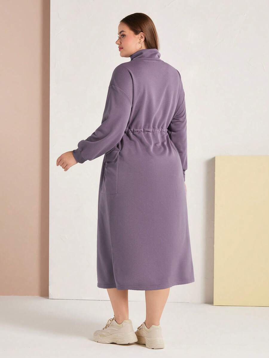 SHEIN Mulvari Plus Size Long Sleeve Drawstring Waist Zipper Half Placket Dress