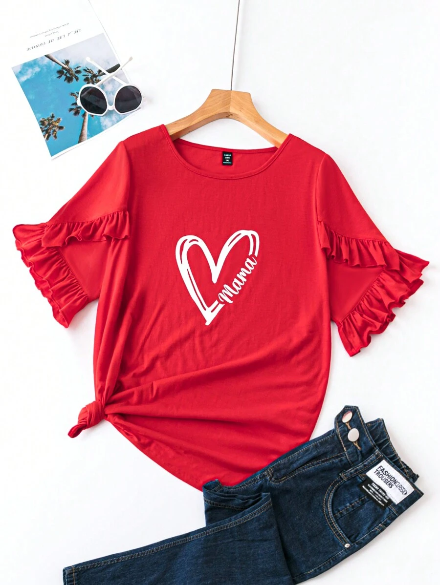 SHEIN LUNE Plus Size Love Heart Graphic Ruffle Trim Short Sleeve T-shirt