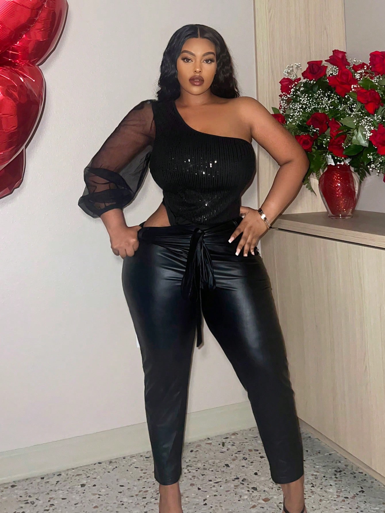 SHEIN Slayr Plus Size One Shoulder Shiny Sequin Patchwork Sheer Mesh Bodysuit In Solid Color