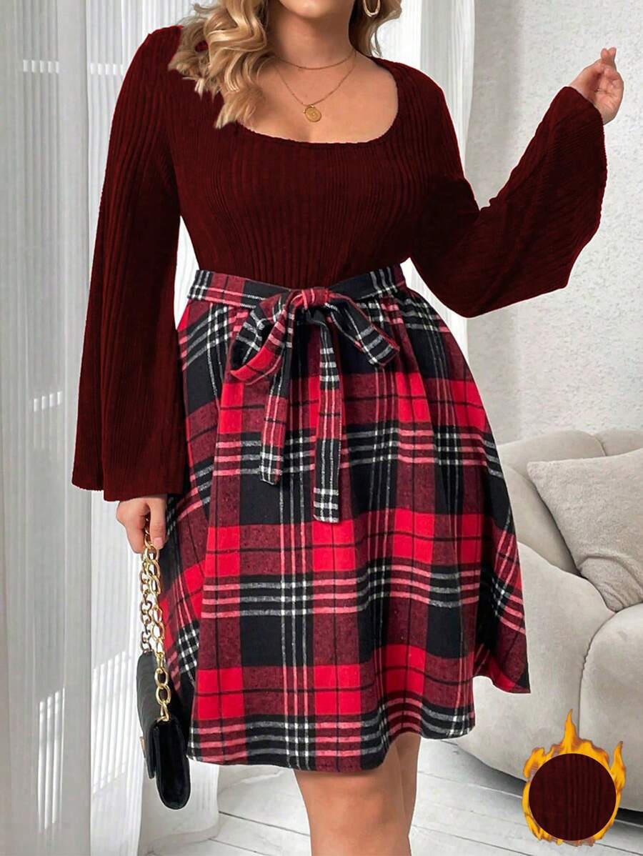 SHEIN Frenchy Plus Size Plaid Belted Bell Sleeve Dress