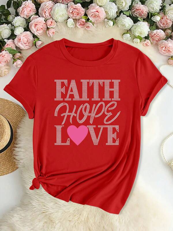 SHEIN Slayr Plus Size Round Neck T-Shirt With Slogan And Heart Pattern