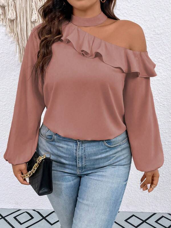 SHEIN Privé Plus Size Single-Shoulder Long Sleeve Ruffle Trim Blouse