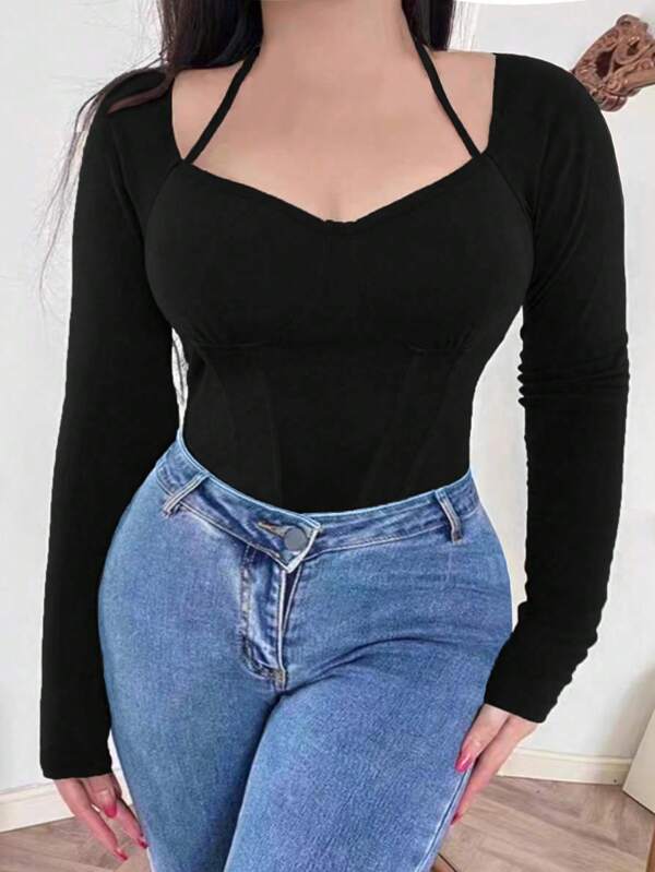 Plus Size Solid Color Halter Neck Long Sleeve T-Shirt