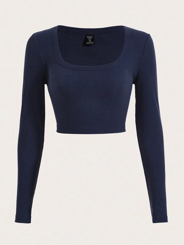 SHEIN EZwear Plus Size Tight Knitted Square Neck T-shirt With Ruffled Hem
