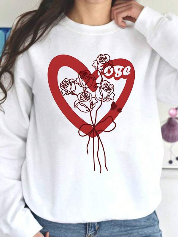 Plus Size Valentine's Day Rose Heart Printed Round Neck Sweatshirt