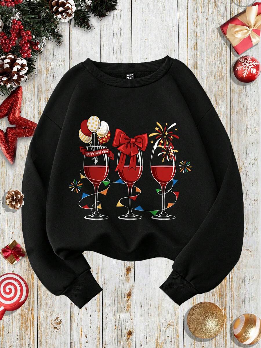 SHEIN LUNE Women's Plus Size Cartoon Printed Loose Fit Sweater With Round Neck For New Year