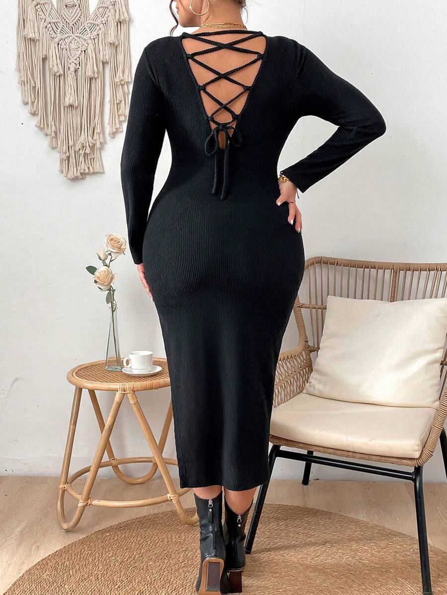 SHEIN Privé Plus Size Women'S Back Cross Strap Detail Slim Fit Bodycon Dress