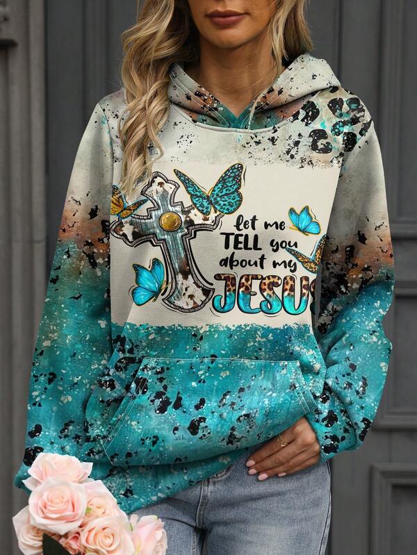 Plus Size Women'S Butterfly & Slogan Printed Hoodie Sweatshirt