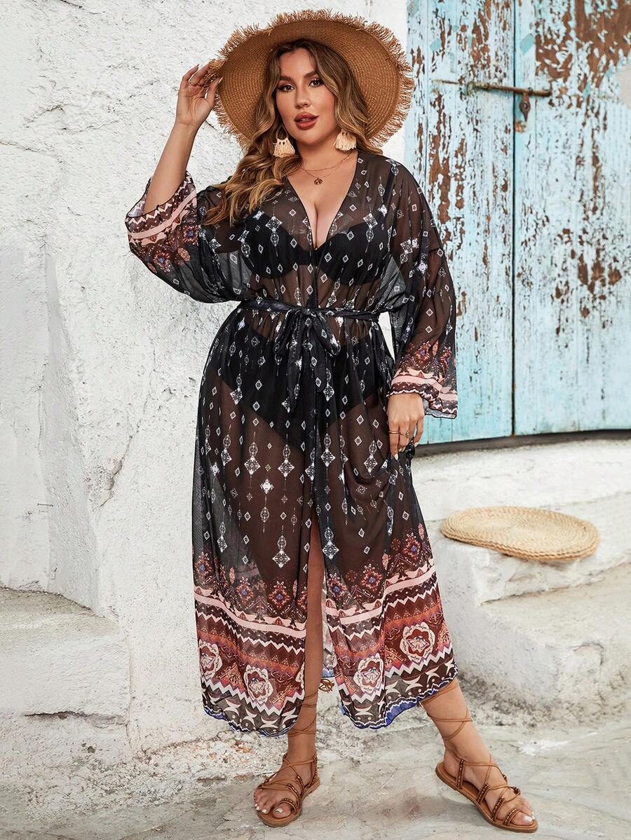 SHEIN Swim BohoFeel Plus Size Women's Geometric Pattern Perspective Kimono
