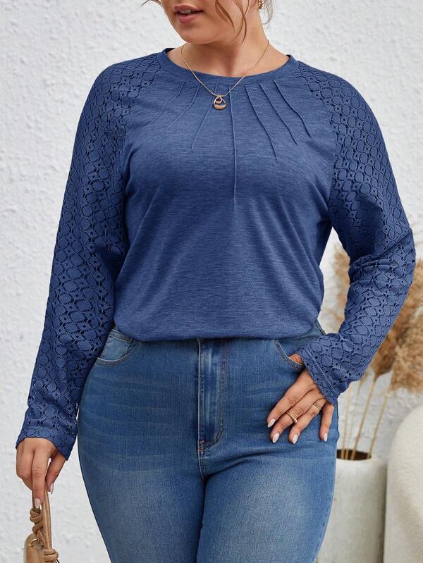 SHEIN Frenchy Plus Size Women'S Lace Patchwork Cap Sleeve Raglan Sleeve T-Shirt
