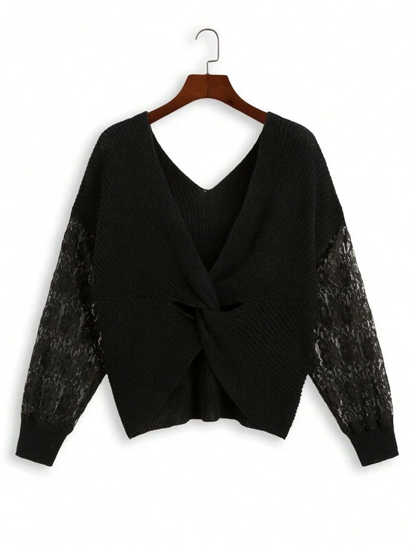 SHEIN Privé Plus Size Women'S Lace Patchwork Twist Knit Sweater Pullover