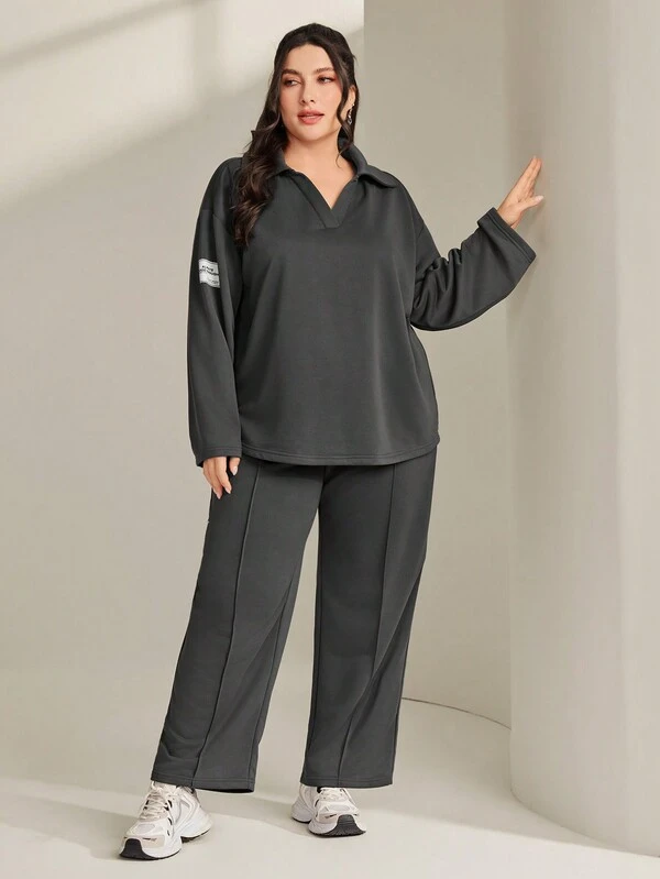 SHEIN Mulvari Plus Size Women'S Letter Patchwork Turn-Down Collar Sweatshirt And Long Pants Set