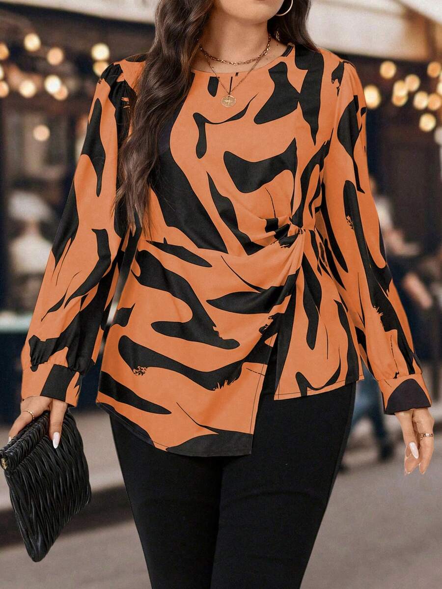 SHEIN Essnce Plus Size Women'S Pattern Printed Twist Front Shirt With Waist Tie