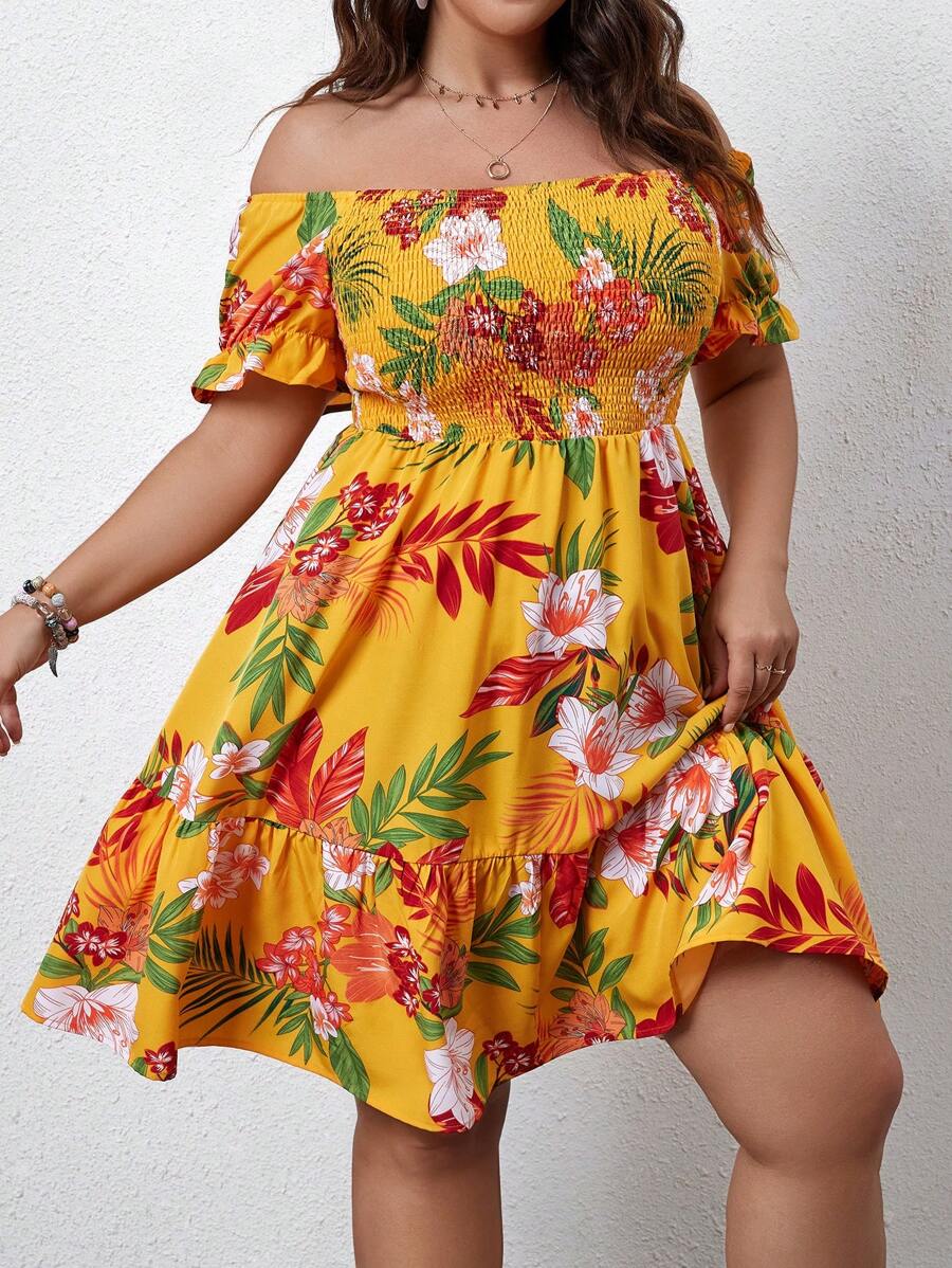 SHEIN Privé Plus Size Women's Plant Print Off Shoulder Dress