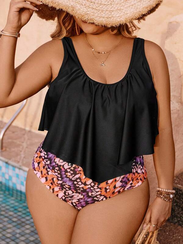 SHEIN Swim Classy Plus Size Women'S Printed One-Piece Swimsuit With Double Shoulder Straps