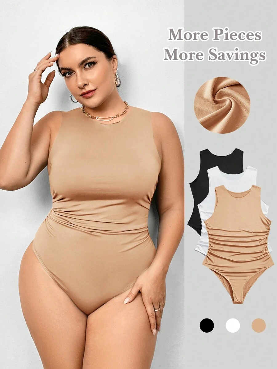 SHEIN Essnce Plus Size Women'S Solid Color Pleated Bodysuit