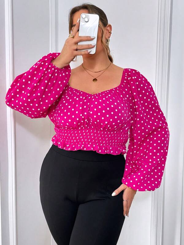 SHEIN Privé Plus Size Women'S Spring Clothing Square Neck Colorful Polka Dot Lantern Sleeve Pleated Waist Long Sleeve Shirt