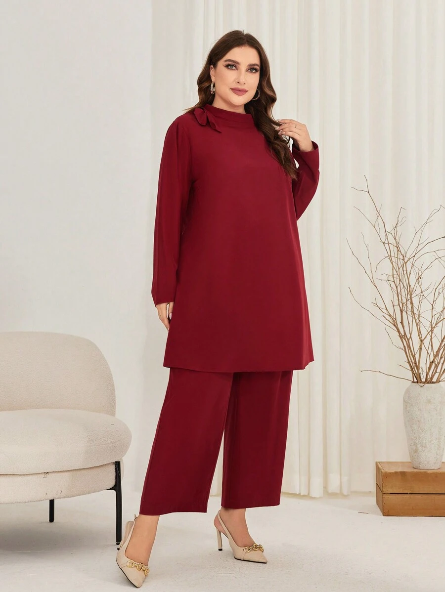 SHEIN Mulvari Plus Size Women's Stand Collar Bowknot Long Top And Wide Leg Pants Casual Two-Piece Set