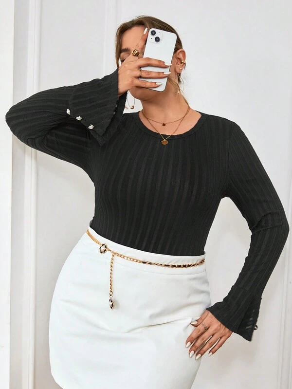 SHEIN Privé Plus Size Women'S Striped Bell Sleeve T-Shirt