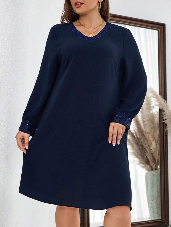 EMERY ROSE Plus Size Women'S V Neck Long Sleeve Shift Dress