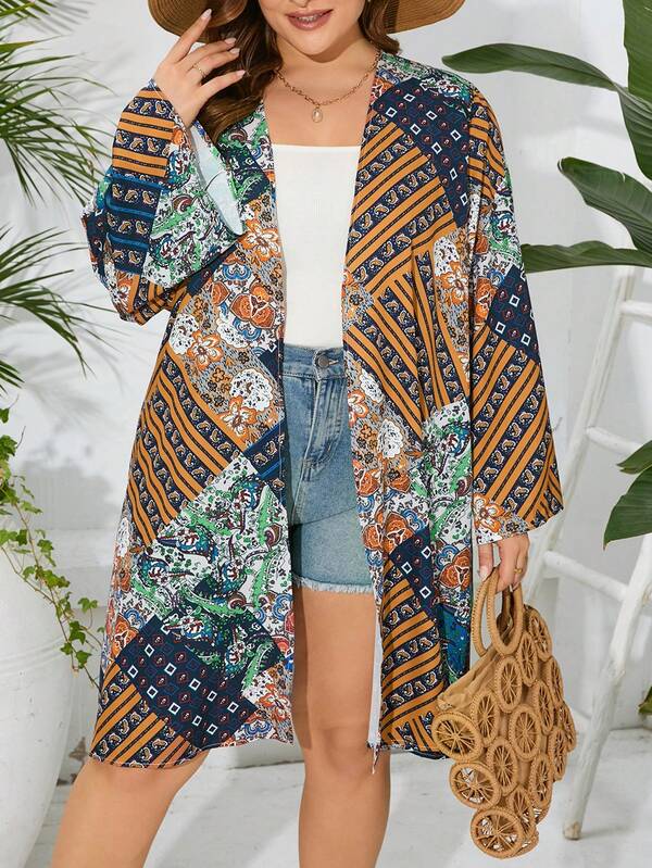 SHEIN Swim BohoFeel Plus Size Women'S Vintage Kimono With Floral Print