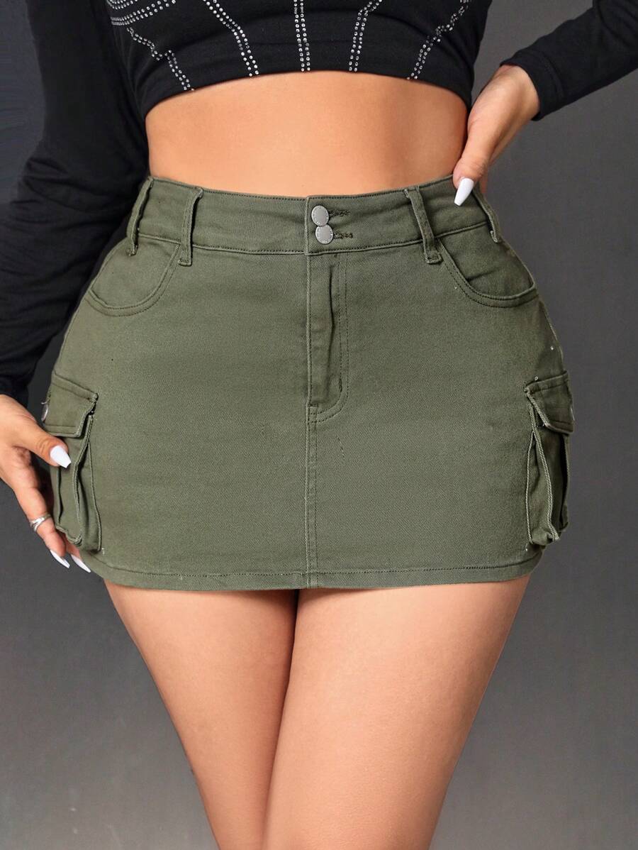 SHEIN ICON Plus Size Women's Workwear Denim Skirt With Pockets