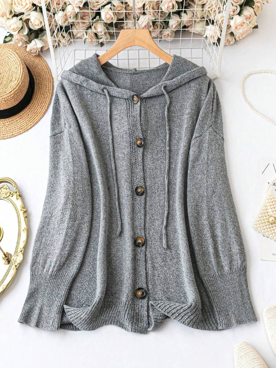 SHEIN CURVE+ Plus Size Women's Drawstring Hooded Button Up Cardigan Sweater