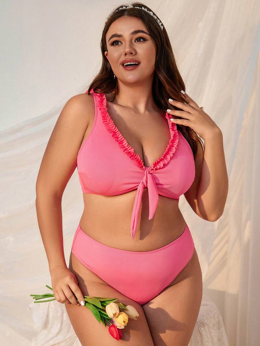 SHEIN Swim Mod Plus Size Women's Ruffle Trimmed Ribbed Swimwear Set
