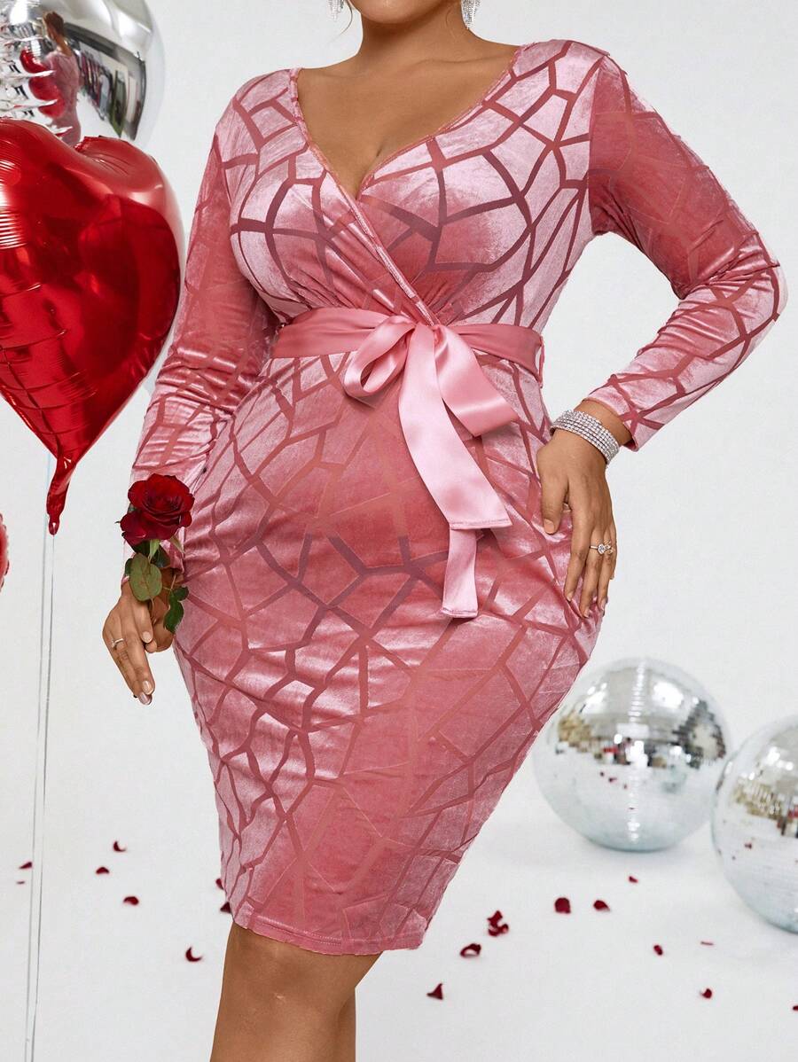 SHEIN SXY Plus Size Wrap Neckline With Waist Tie Long Sleeve Velvet Dress
