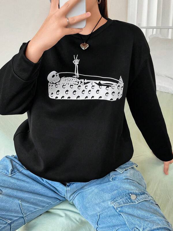 Plus Skeleton Print Drop Shoulder Sweatshirt