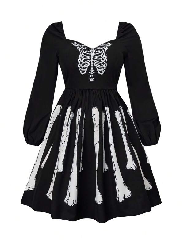 Plus Skeleton Print Sweetheart Neck Lantern Sleeve Dress