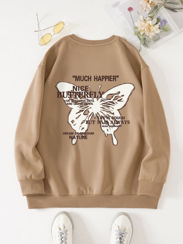 Plus Slogan & Butterfly Print Thermal Lined Sweatshirt