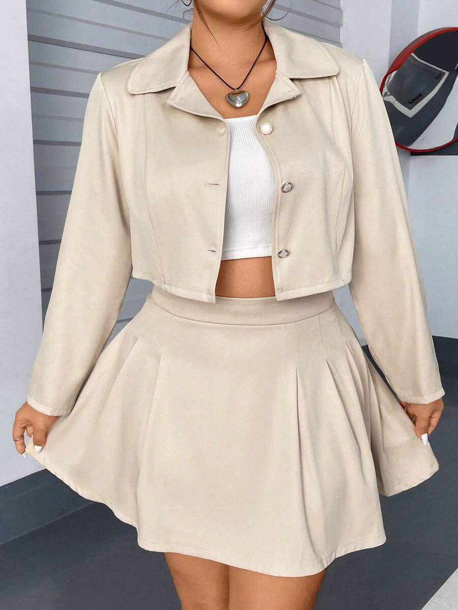 SHEIN Plus Solid Button Front Crop Jacket & Pleated Skirt