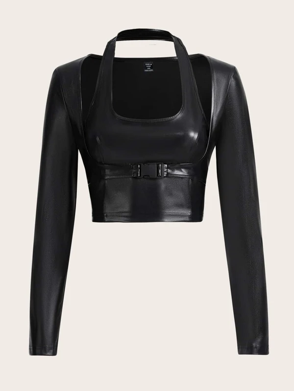 ROMWE PUNK Plus Solid PU Leather Buckle Detail Crop Halter Neck Blouse