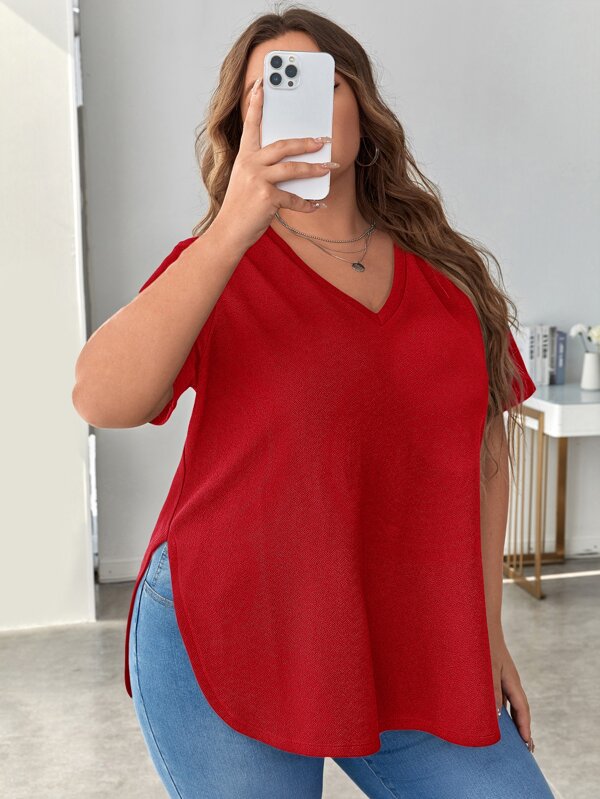 SHEIN LUNE Plus Solid V Neck Split Hem Tee