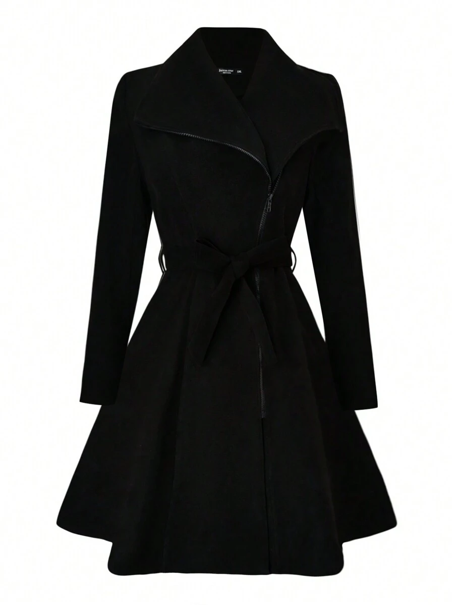 Plus Solid Zip Up Belted Flare Hem Overcoat