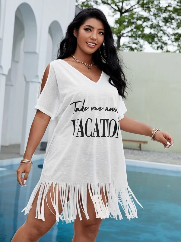 SHEIN WYWH Plus Split Sleeve Slogan Graphic Fringe Hem Dress