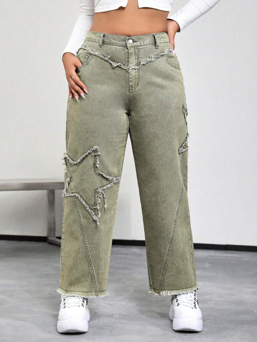 Plus Star Pattern Raw Trim Straight Leg Jeans