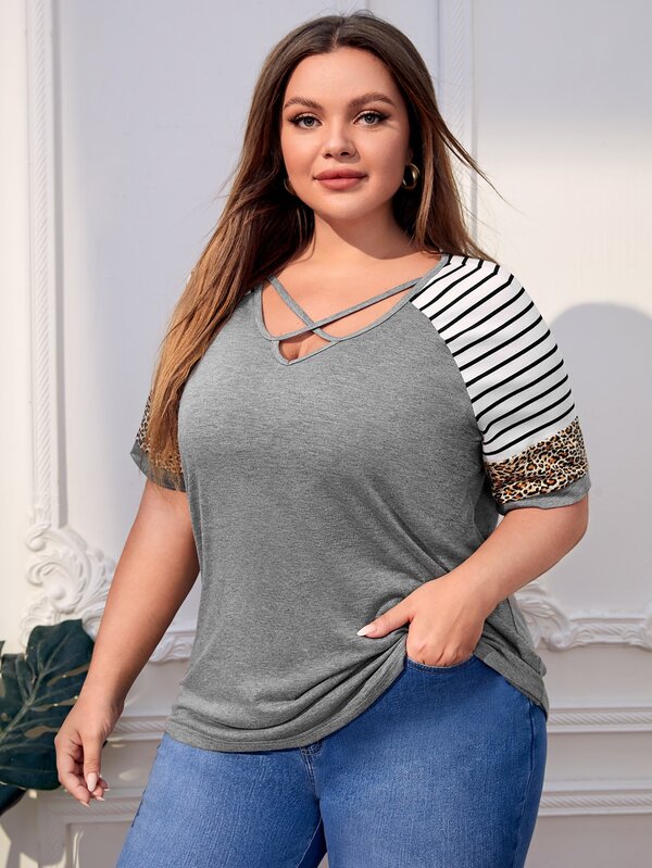 SHEIN LUNE Plus Stripe & Leopard Print Criss Cross Raglan Sleeve Tee