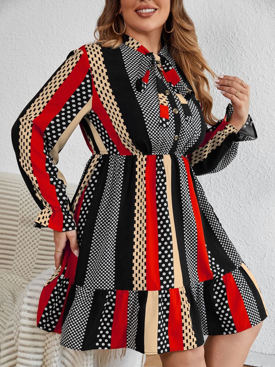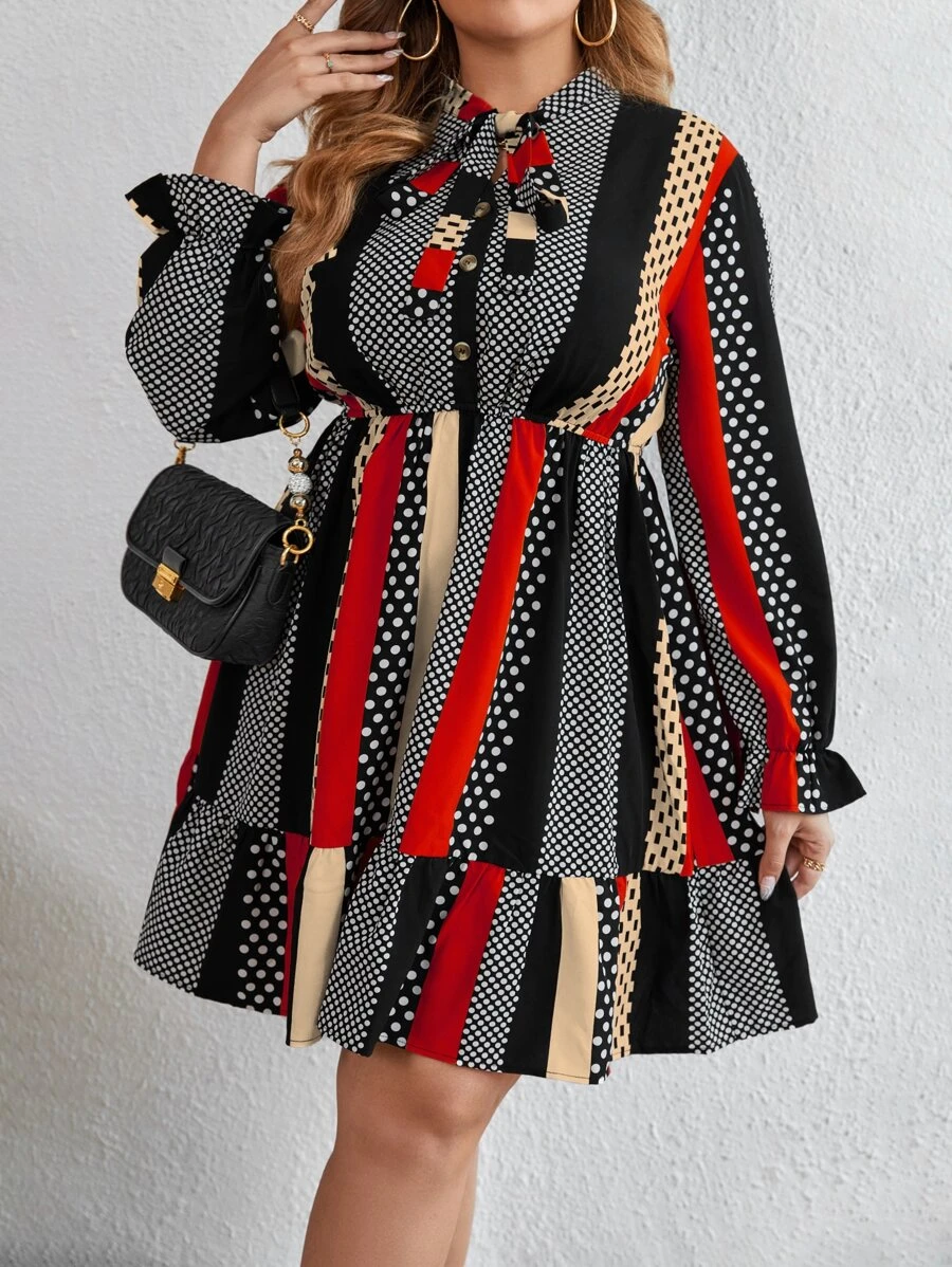 SHEIN LUNE Plus Striped & Polka Dot Tie Neck Flounce Sleeve Ruffle Hem Dress