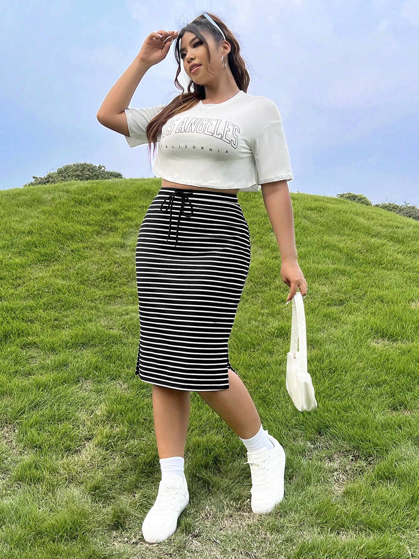 SHEIN EZwear Plus Striped Print Drawstring Waist Split Hem Skirt