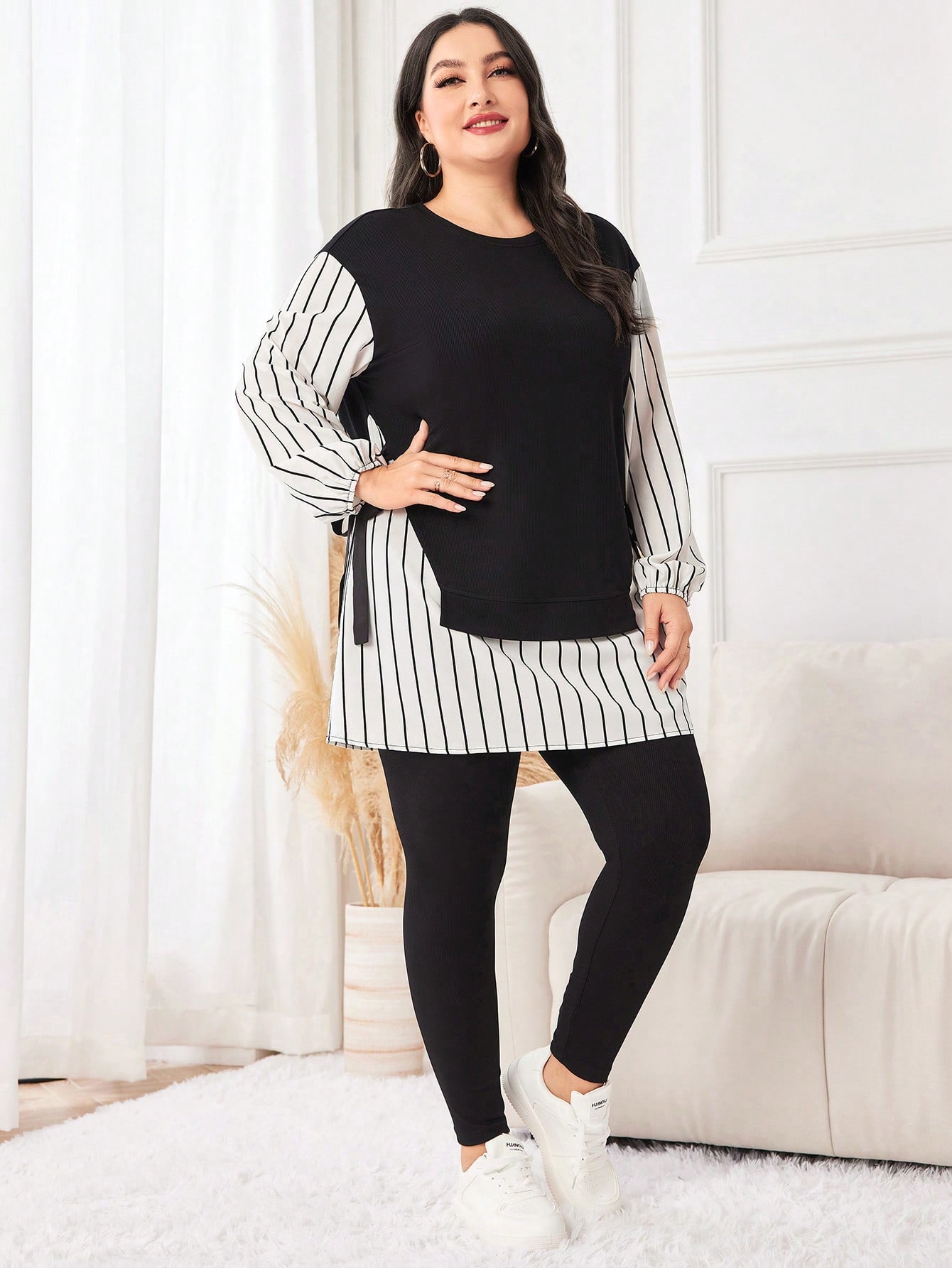 SHEIN Mulvari Plus Striped Print Drop Shoulder Split Hem Tee & Leggings