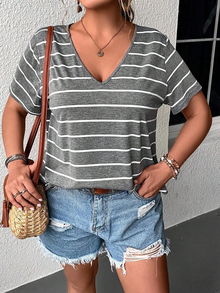 SHEIN LUNE Plus Striped Print V Neck Tee