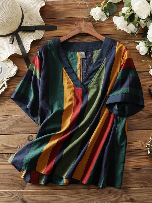 SHEIN Mulvari Plus Striped V Neck Blouse