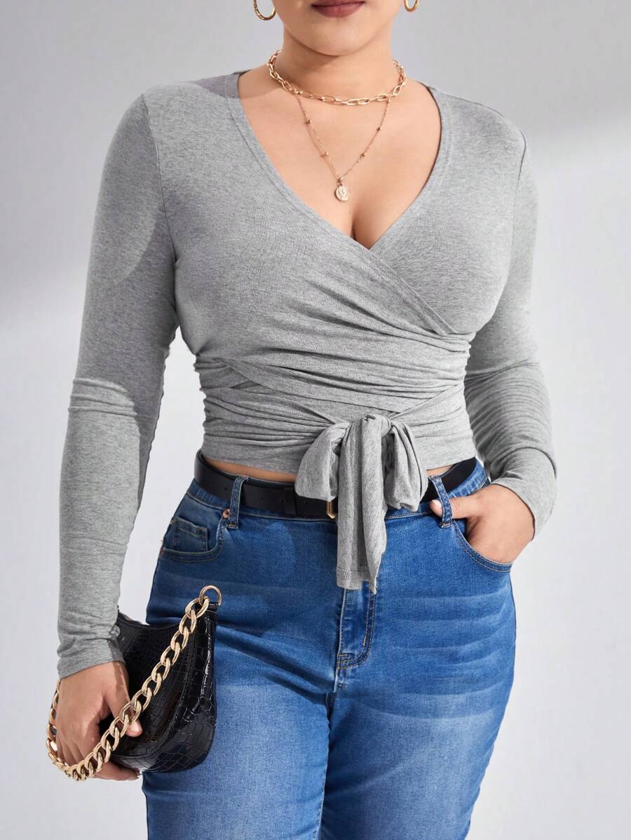 SHEIN Privé Plus Surplice Neck Knot Front Crop Tee