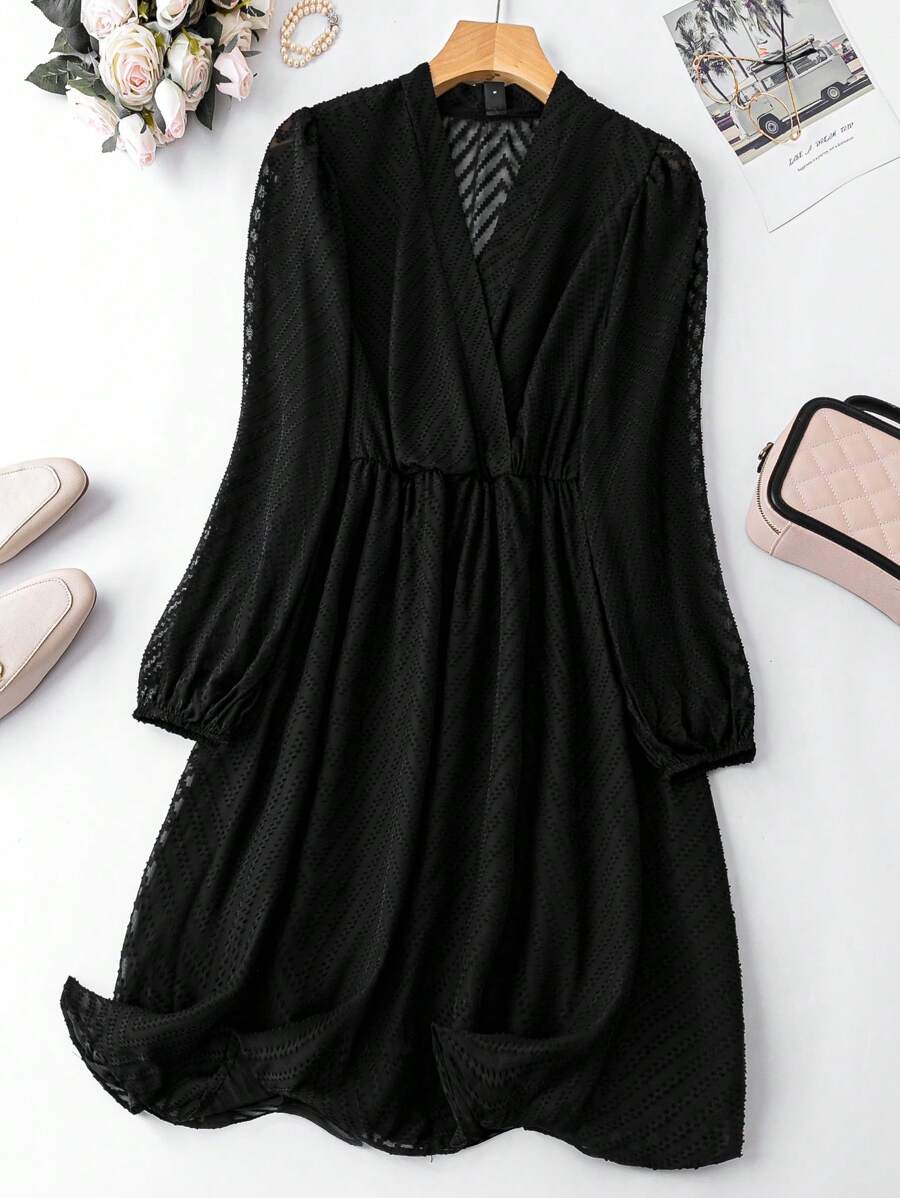 SHEIN Privé Plus Swiss Dot Surplice Neck Lantern Sleeve Dress