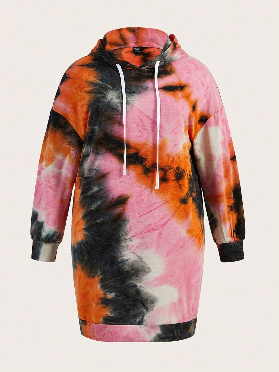 SHEIN LUNE Plus Tie Dye Drop Shoulder Drawstring Hooded Dress
