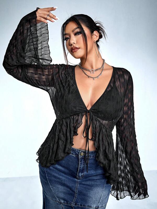 SHEIN ICON Plus Tie Front Flare Sleeve Ruffle Hem Top