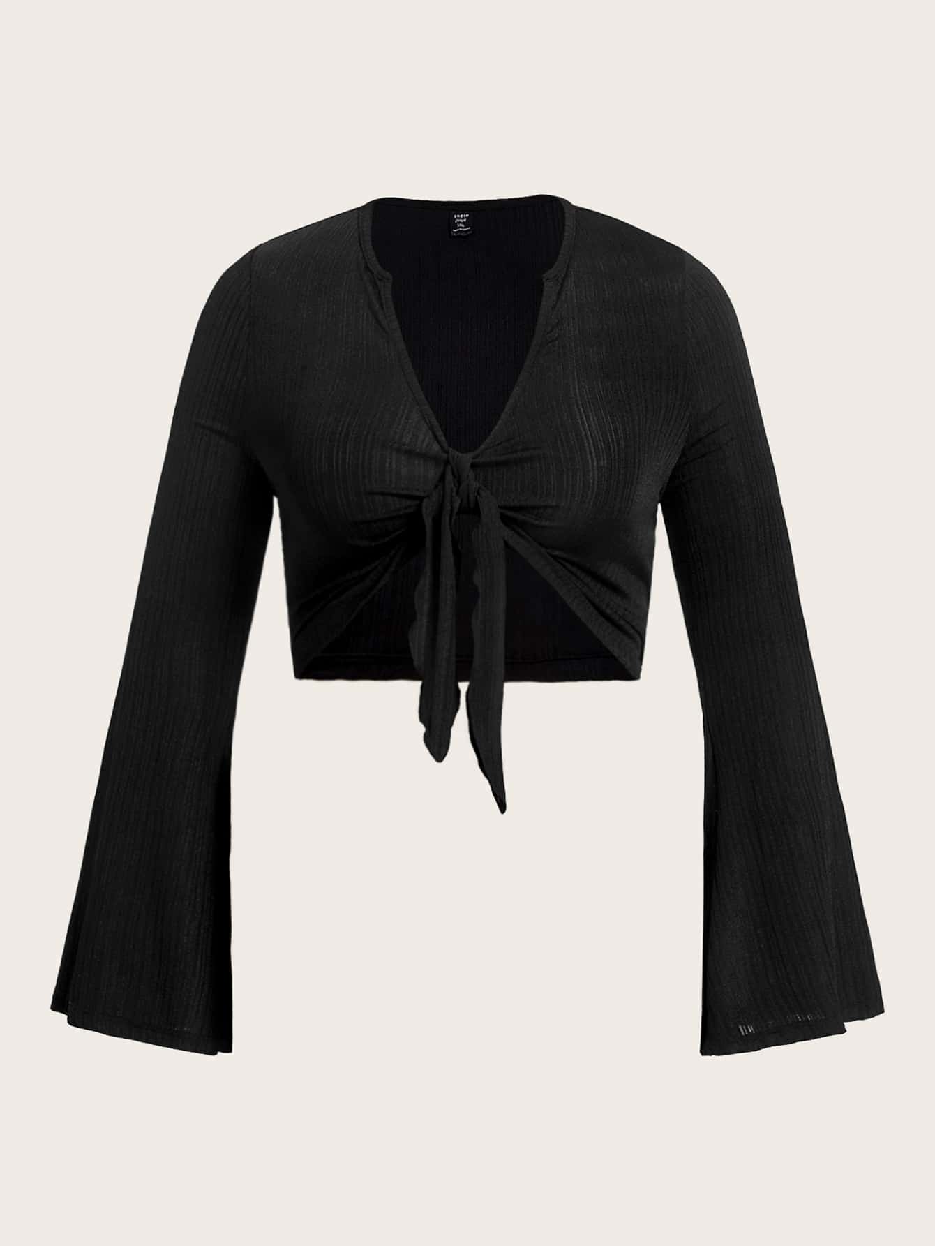 SHEIN EZwear Plus Tie Front Trumpet Sleeve Crop Tee