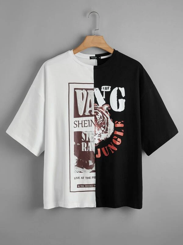 SHEIN Unity Plus Tiger & Letter Graphic Two Tone Tee